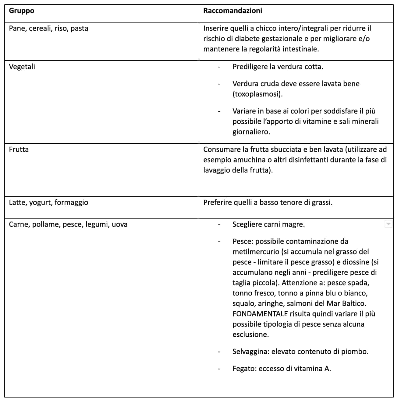 Tabella riassuntiva con le raccomandazioni da seguire