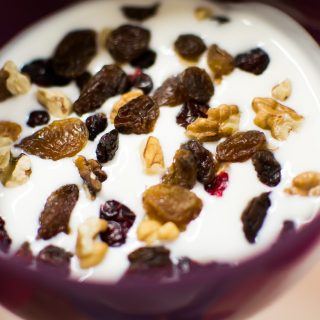 2. Inserire gli ingredienti a strati in una coppa di vetro: prima un po’ di pesche, poi un po’ di yogurt, i biscotti e le nocciole, miele, ancora pesche e yogurt e terminare con cannella, uvetta e pesche per decorare .