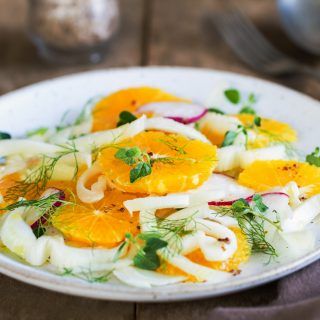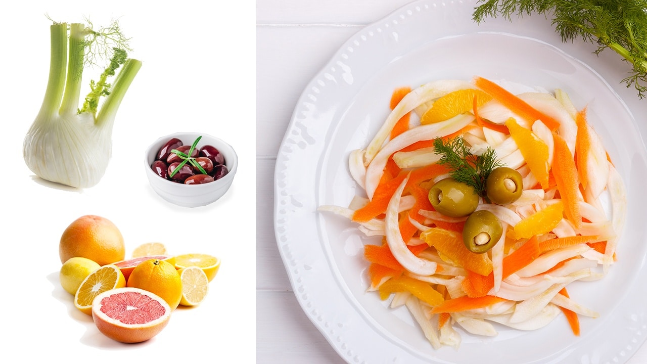Ottima per accompagnare pesce o carne alla piastra, unisce il gusto fresco dei finocchi al dolce dell’arancia e l’amarotico delle olive taggiasche.