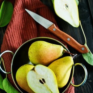 1. Sbucciate e tagliate le pere a pezzettini, mettetele in una ciotola con il succo di limone e mescolate.